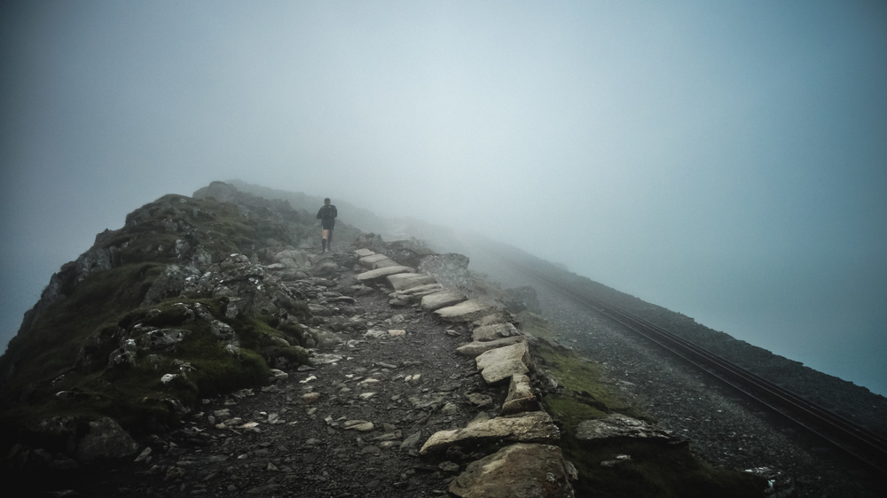 Since you are running along the ridge of the range, some of the undefoot conditions will be bar, broken rocks, particularly when you go over Foel Fras. This is eerily beautiful (especially in the fog) but can make for quite treacherous underfoot conditions, so be careful. This will also slow you down quite a bit.
