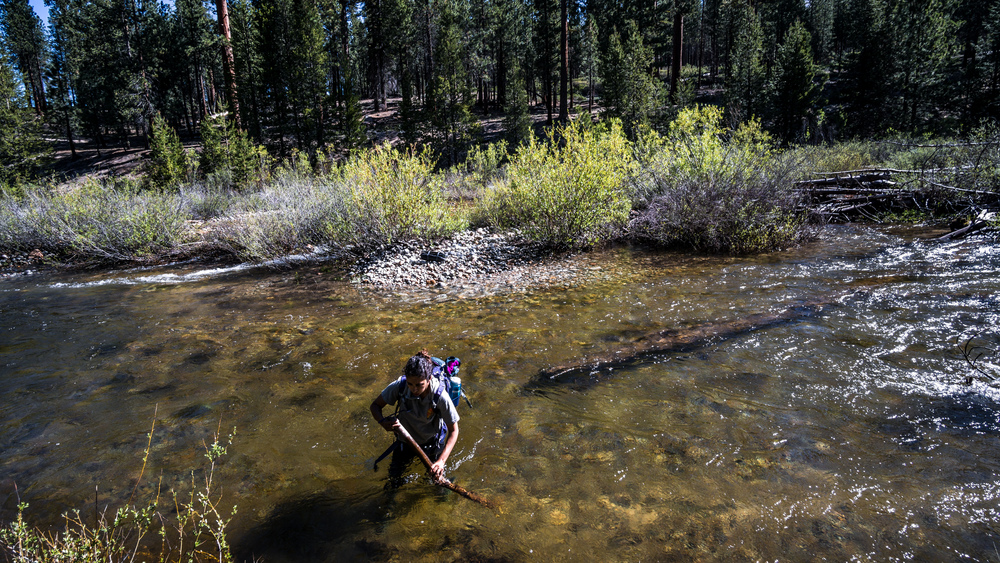 When we did this trip, in early June, the water was flowing fast and deep at the official fording point of the trail. We did not think this was safe, so headed 1/3 or 1/2 mile upstream where the river was broader and forded it there. Still the water was waist deep (and COLD) and moving swiftly, but we managed to safely cross it. If you do it in late summer or autumn, you should be fine to ford it at the designated spot.